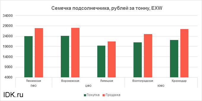 За прошедшую неделю с 04.05.2020 по 08.05.2020 средняя цена семечки подсолнечника, согласно выставленным заявкам трейдеров, выросла по всем округам на 953 рубля. Средняя цена составляет 24380 рублей за тонну.