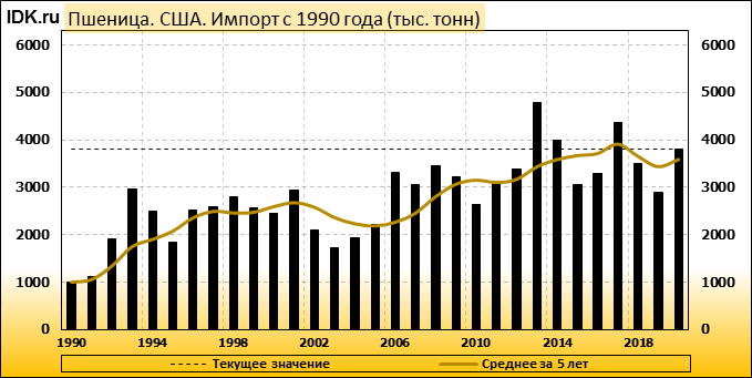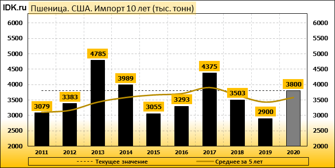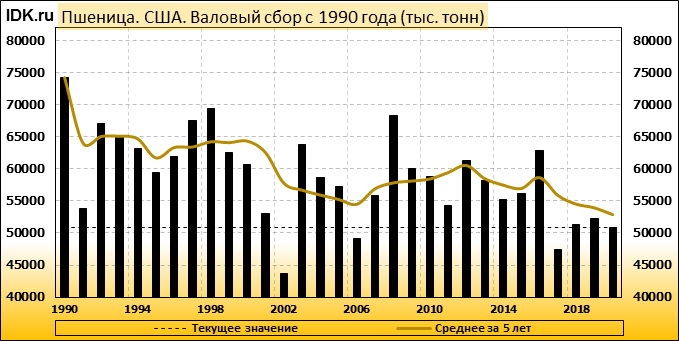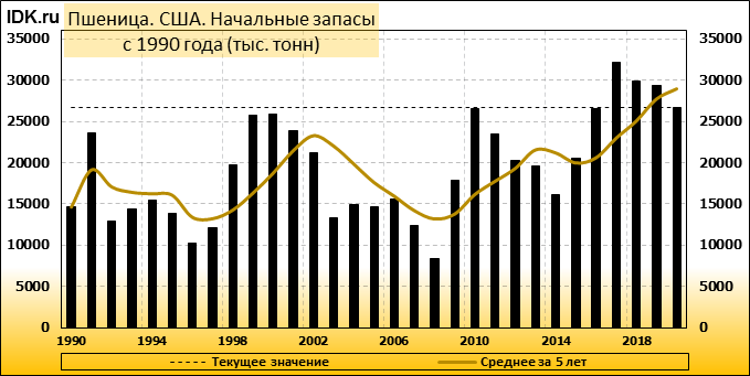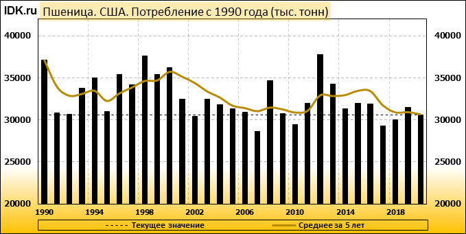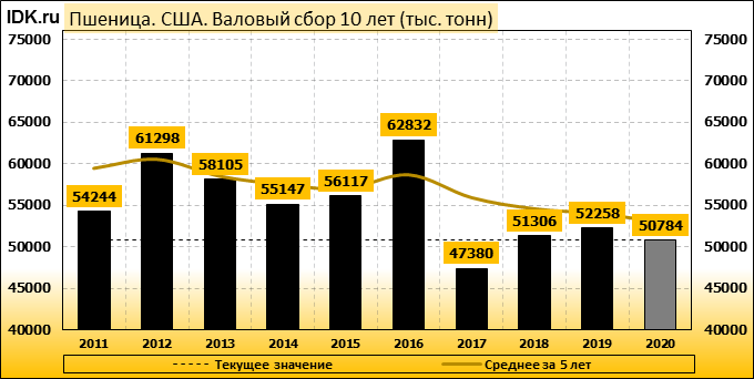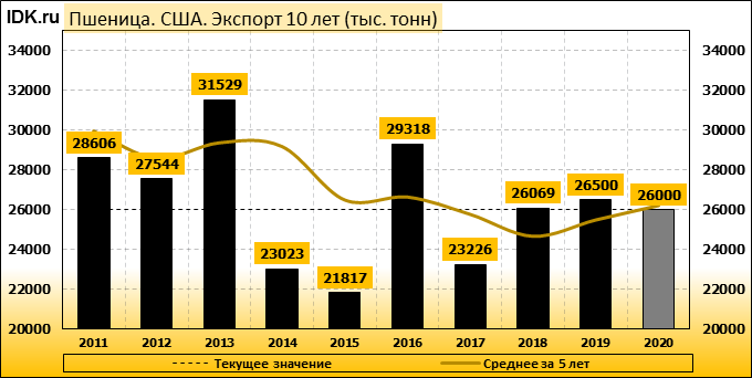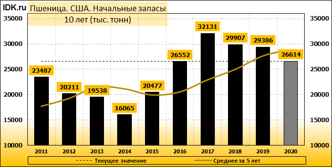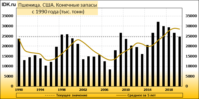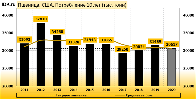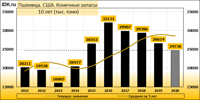 Первоначальный прогноз для пшеницы в США на 2020/21 г. включает уменьшение запасов, сокращение внутреннего потребления, сокращение экспорта и снижение остатков. Запасы снижены с 2019/20 г. на 121 млн. бушелей из-за сокращения начальных остатков и уменьшения производства. Согласно прогнозу, урожай пшеницы в США в 2020/21 году составит 1 866 млн. бушелей, что на 3 процента меньше, чем в прошлом году, из-за снижения урожайности, нивелирующего увеличение уборочных площадей. Экспорт на 2020/21 год прогнозируется на уровне 950 миллионов бушелей, что на 20 миллионов меньше пересмотренного экспорта 2019/20 года. Прогнозируемые конечные остатки на 2020/21 год на 69 миллионов бушелей ниже, чем в прошлом году, и составляют 909 миллионов.