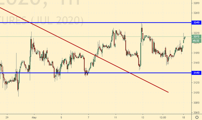 Уровень 314.0 остается значимой поддержкой. Видим попытки быков растолкать рынок вверх. Если сегодня удастся пройти выше 325.0, то можно будет поискать цели вверху, в противном случае нас ждет долгий коридор, который может рано или поздно прорвется вверх или вниз под влиянием погоды. Чем больше будет благоприятных дней, тем меньше шансов на движение вверх.