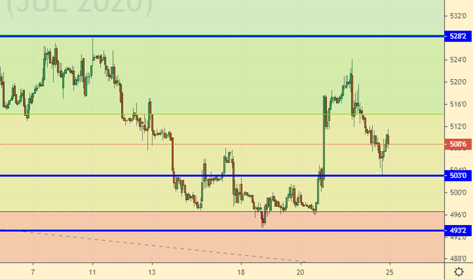 Увидели откат к 506.0, что позволило войти в рынок тем, кто ранее пропустил рывок выше 500.0. На самом деле, ситуация на рынке крайне драматичная, так как цены не могут вырасти даже на фоне неопределенности с объемами будущего урожая. Это создает неприятные обстоятельства для производителей. После поступления на рынок свежих партий пшеницы цены рискуют надолго застрять под уровнем 500.0. Пока рассчитываем на рост, но большого фундаментального оптимизма нет.