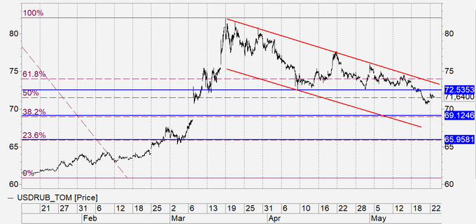 Вряд ли мы сегодня увидим рост пары выше 72.50. Нефть находится на хороших уровнях. Стратегия правительства по привлечению средств через займы, для покрытия проблем связанных с коронавирусом, также ясна и в целом принята торговым сообществом. Возможно, что рубль почувствует давление ближе к середине июня, когда будет отыгрываться высокая вероятность снижения процентной ставки ЦБ РФ с 5.5 до 4.5 процента.