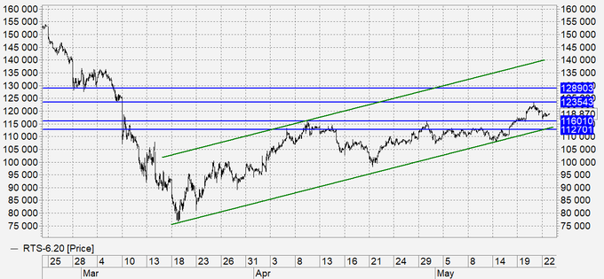 От наступающего дня не ждем сильных движений. Пока нефть находится в районе 35.00, а доллар стоит меньше 73.00 рублей, индекс РТС не будет испытывать серьезных проблем. Текущие уровни, не говоря о районе 113000, могут быть интересны для небольших тактических покупок, в расчете на то, что пока продолжаются продажи доллара в рамках бюджетного правила, а это будет продолжаться до 4-го июня, индекс РТС будет получать постоянную поддержку от укрепляющегося рубля и продолжит свой рост.