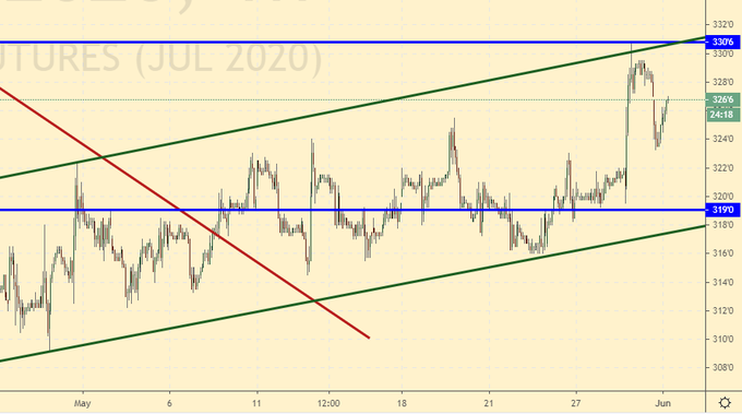 Быки пытаются раскачать рынок. Оптимизм от ожидания предстоящей вакцинации и прекращения карантина способен отправить котировки на 350.0, более сильный рост не просматривается, так как объемы будущего урожая будут на фантастическом уровне. Вместе с тем, ожидается, что потребление достигнет рекордного уровня с увеличением продовольственного и кормового потребления, а также из-за восстановления спроса со стороны промышленности.