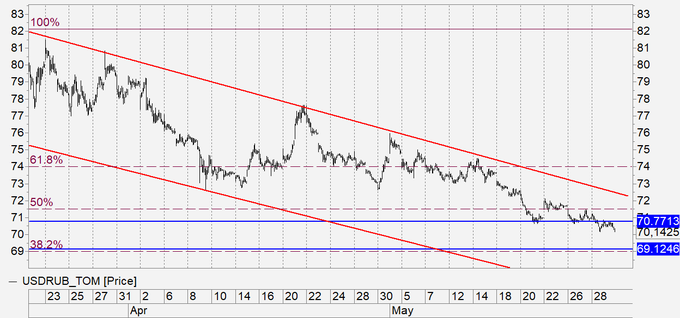 Рубль продолжит сегодня укрепляться на фоне растущей нефти. Поход к 69.00 выглядит обоснованным, более глубокое погружение должно быть поддержано ходом Brent выше 40.00. Не забываем, что продажи доллара Минфином будут идти до 4-го числа, а 19-го числа Набиуллина должна снизить ставку на 1%. Эти факторы способны затормозить укрепление рубля.