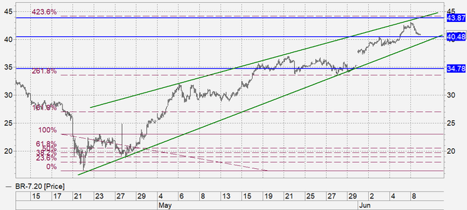 В случае падения цен ниже уровня 40.00 рынок имеет все шансы перейти к коррекционному ходу в район 35.00. Если в будущем будут поступать данные о сдержанном восстановлении экономики, мы сможем пройти и к 30.00.