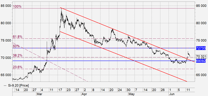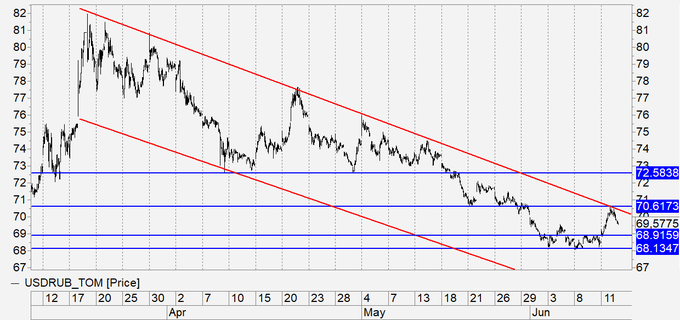 Перешли на сентябрьский фьючерс. На рынке TOM мы пока остаемся внутри канала. На фьючерсе уже вышли вверх. Шансы на продолжение укрепления рубля остаются. Как минимум, просматривается спуск к 68.95. Для более сильного роста национальной валюты нужен рост нефти.