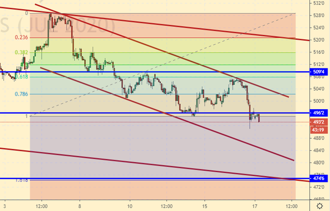 После того как мы прошли ниже 500.0, цель на 475.0 становится вполне достижимой. Падение к 445.0 возможно уже в середине июля под давлением нового урожая.