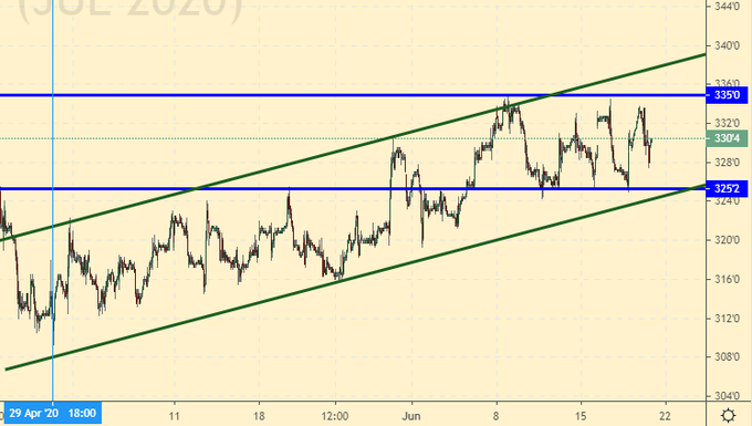 На Украине озимая пшеница ускорила переход от фазы цветения к фазе молочной и молочно-восковой спелости зерна на полторы-две недели раньше обычных сроков. Из-за засухи в южных областях зерно формируется мелким, что может привести к уменьшению урожайности на 15-30%, а местами и 50%. Не исключено, что мы увидим подтверждение этим данным от USDA в июльском отчете, что поддержит цены. Только где мы на тот момент будем? На 450.0?