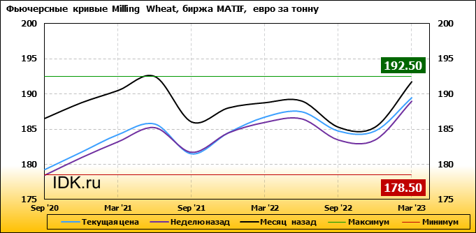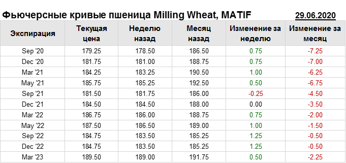 На 29.06.2020 стоимость пшеницы Milling Wheat на бирже MATIF по контракту Sep ’20 составила 179.25 евро за тонну. За прошедшую неделю стоимость пшеницы Milling Wheat выросла на 0.75 евро/тонна. Как мы видим на графике, фьючерсная кривая имеет периоды, когда более дальний фьючерс дешевле ближнего. Состояние бэквардации наблюдаем на следующих контрактах: Sep ’21, Sep ’22. Таким образом, трейдеры предполагают, что возможно превалирование предложения над спросом в указанные периоды.