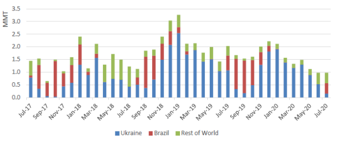 Экспортные цены на фуражную кукурузу в Причерноморье были выше конкурирующих цен в США и Южной Америке с середины апреля до конца августа, с наценкой от 10 до 25 долларов за тонну. Объем экспорта Украины имеет тенденцию к снижению в июне, поскольку внутренние запасы сокращаются и ожидания в отношении нового урожая начинают реализовываться. На предстоящий урожай 2020/21 года негативно повлияла неблагоприятная погода, что привело к снижению оценок объемов производства, но в настоящее время ожидается, что он станет рекордным и приведет к рекордным 30,5 млн. тонн экспорта, что на 1,3 млн. тонн больше, чем в предыдущем году. Что касается ЕС, ожидание собственного урожая кукурузы и негативное влияние COVID-19 на гостиничный, ресторанный и институциональный спрос на мясо дает понимание слабых показателей июля для обоих торговых партнеров. Несмотря на это, импорт в ЕС, согласно прогнозу, вырастет до 24,0 млн. тонн, компенсируя снижение ожидаемого кормового потребления пшеницы.