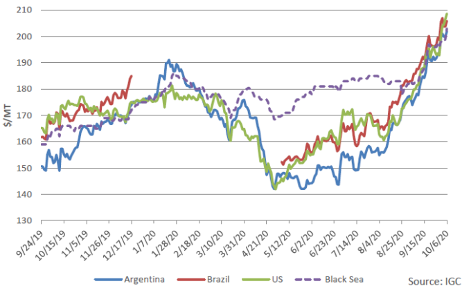 С момента публикации сентябрьского отчета WASDE цены основных экспортеров резко выросли. Цены в США выросли на 28 долларов за тонну до 209 долларов. Сентябрьский отчет NASS о зерновых запасах показал, что конечные остатки кукурузы существенно снизились по сравнению с сентябрьским WASDE, оказавшись значительно ниже торговых ожиданий. Цены в Черноморском регионе выросли на 20 долларов за тонну до 203 долларов, поскольку сохраняются опасения по поводу засушливых условий в Румынии и Украине. Цены в Бразилии выросли на 18 долларов за тонну до 206 долларов, поскольку экспортные интересы продолжают конкурировать с потребностями внутреннего рынка. Цены в Аргентине выросли на 24 доллара за тонну до 202 долларов, благодаря ограниченной доступности запасов и сохраняющемуся высокому внешнему спросу.