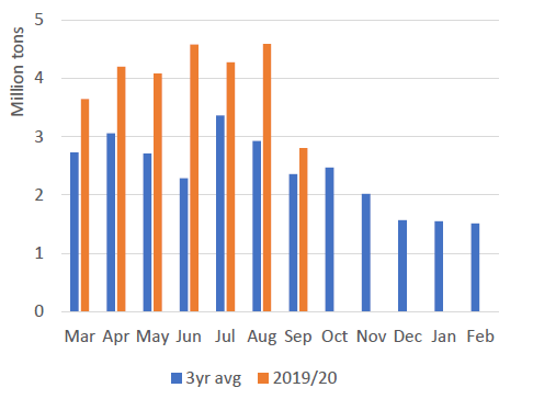Экспорт кукурузы Аргентины в 2019/20 (март-февраль) маркетинговом году в этом месяце повышен до рекордных 38,0 млн. тонн. Совокупный ежемесячный экспорт с марта по август и данные об отправленных судах за сентябрь составили 28,2 миллиона тонн, что примерно на 45 процентов выше среднего уровня за предыдущие 3 года. Хотя экспорт и поставки по традиционным направлениям были больше, данные также включают нетрадиционные направления, а именно Ирак, Ливан, Нигерию и Перу.