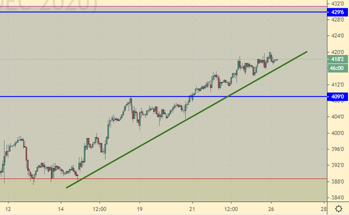 Рынок не откатывает, не давая нам возможности купить. В складывающихся обстоятельствах просто ждем достижения цели на 430.0, где будем продавать. Отметим, что если американская валюта продолжит слабеть, то цены на кукурузу на Чикагской бирже вырастут, так как слабый доллар даст преимущества американской кукурузе на внешнем рынке.