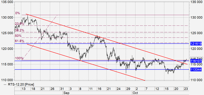 Цены пробили вверх падающий канал шириной в 10000 пунктов, что заставляет нас рассуждать о возможном росте к 126000, так как точка пробоя находится на 116000. Более сильный рост пока не просматривается. Для этого или конъюнктура должна стать лучше внутри страны, или в Европе и США должны начаться серьезные проблемы экономического и (или) социального характера.