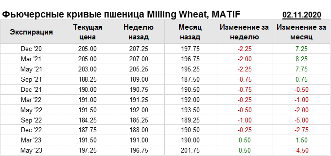 На 02.11.2020 стоимость пшеницы Milling Wheat на бирже MATIF по контракту Dec ’20 составила 205 евро за тонну. За прошедшую неделю стоимость пшеницы Milling Wheat упала на 2.25 евро/тонна. Как мы видим на графике, фьючерсная кривая имеет периоды, когда более дальний фьючерс дешевле ближнего. Состояние бэквардации наблюдаем на следующих контрактах: May ’21; Sep ’21; Sep ’22. Таким образом, трейдеры предполагают, что возможно превалирование предложения над спросом в указанные периоды.