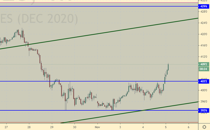 Рынок растет. Это прямая реакция на приближающуюся победу Байдена на выборах. Пока гремят фанфары мы будем подниматься к 430.0, дальше последует протрезвление.