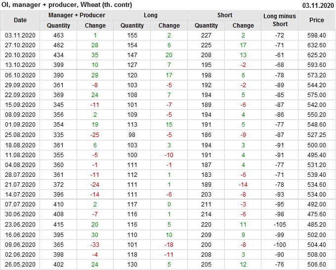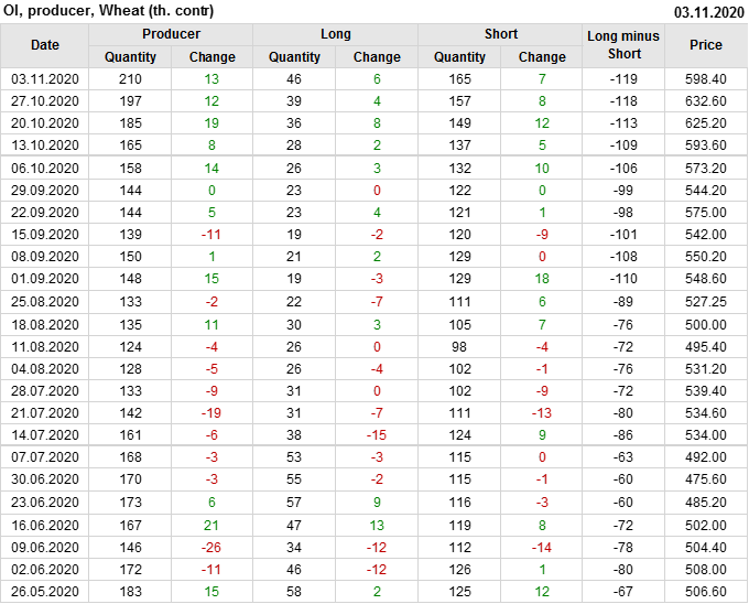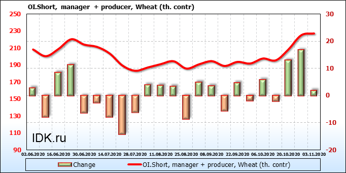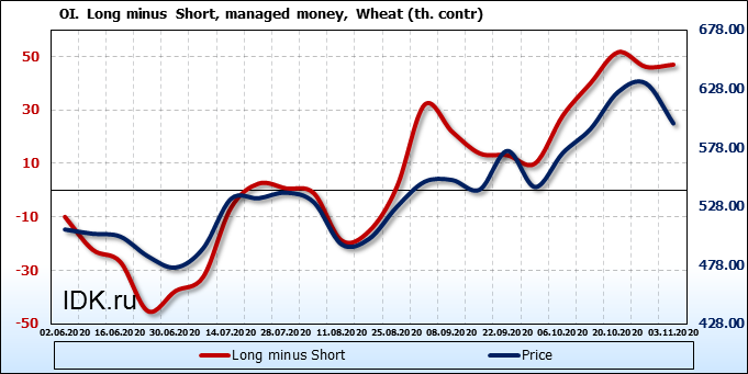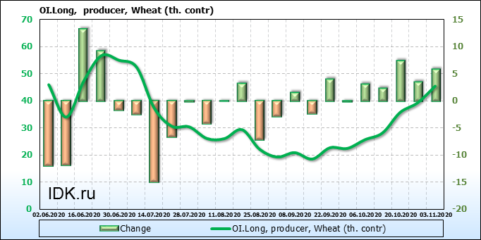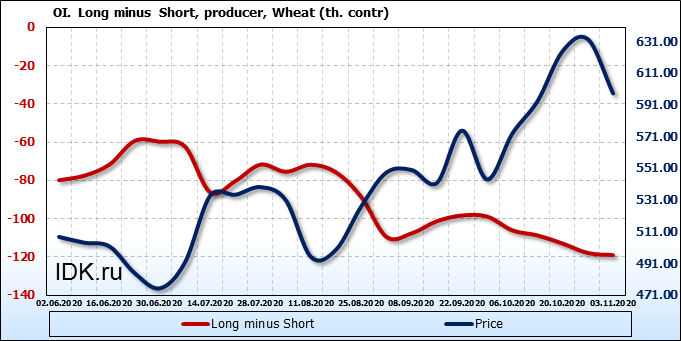 За прошлую неделю, 28.10.20 — 03.11.20, разница между длинными и короткими позициями производителей упала на 1 тыс. контрактов. В тоже время, цена упала на 34.2 цента. Производители наращивают короткие позиции, что не дает цене расти. В такой ситуации на рынке возможно ускорение падения цен.