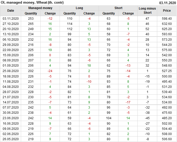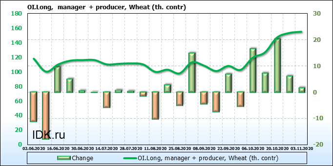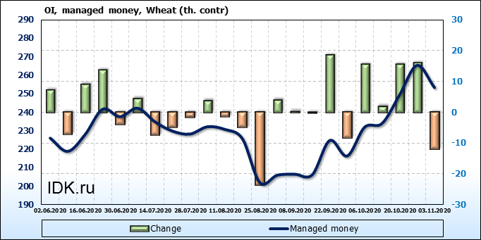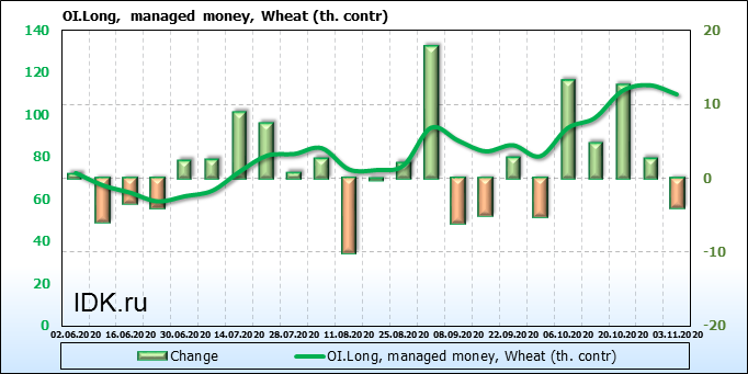 За прошлую неделю, 28.10.20 — 03.11.20, разница между длинными и короткими позициями управляющих выросла на 1 тыс. контрактов. В тоже время, цена упала на 34.2 цента. Управляющие наращивают длинные позиции, что отражает их видение возможностей роста цены в ближайшее время, и это несмотря на то, что цены на отчетной неделе падали. Если давление со стороны покупателей будет продолжено рынок развернется вверх.