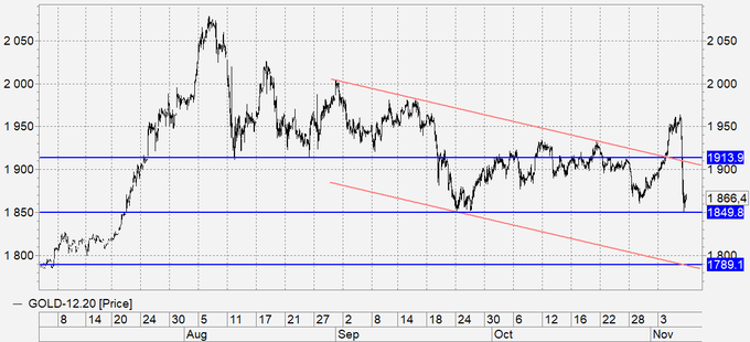 Яркая иллюстрация того насколько виртуальны цены на золото у нас перед глазами. Хорошо, найдена вакцина, допустим, вот только проблемы в мировой, и в частности, американской экономике, никуда не делись. 5% вниз за три часа. Это больно.