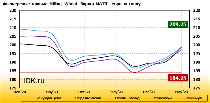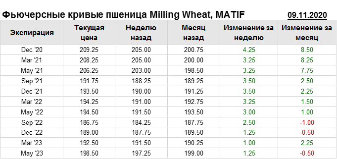 На 09.11.2020 стоимость пшеницы Milling Wheat на бирже MATIF по контракту Dec ’20 составила 209.25 евро за тонну. За прошедшую неделю стоимость пшеницы Milling Wheat выросла на 4.25 евро/тонна. Как мы видим на графике, фьючерсная кривая имеет периоды, когда более дальний фьючерс дешевле ближнего. Состояние бэквардации наблюдаем на следующих контрактах: Mar ’21; May ’21; Sep ’21; Sep ’22. Таким образом, трейдеры предполагают, что возможно превалирование предложения над спросом в указанные периоды.