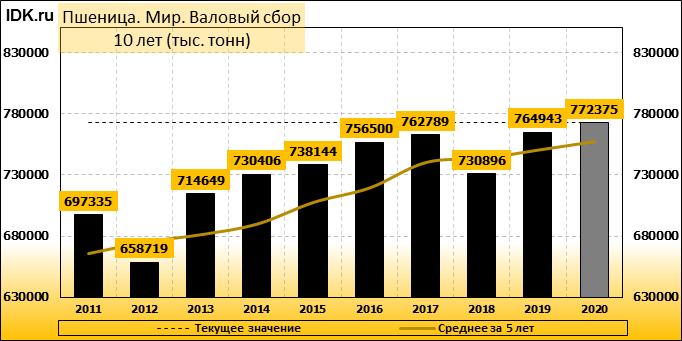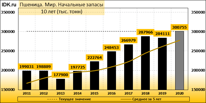 Глобальный прогноз по пшенице на 2020/21 год предусматривает увеличение запасов, повышение потребления и экспорта и сокращение остатков. Запасы увеличены на 0,7 млн. тонн до 1 073,1 млн, поскольку более высокие начальные запасы компенсируют снижение мирового производства, которое остается на рекордном уровне. Большая часть снижения производства в этом месяце приходится на Аргентину, где производство снижено на 1,0 млн. тонн до 18,0 млн. Мировое потребление увеличено на 1,7 миллиона тонн до 752,7 миллиона, в основном за счет увеличения кормового и остаточного потребления для Китая и ЕС.