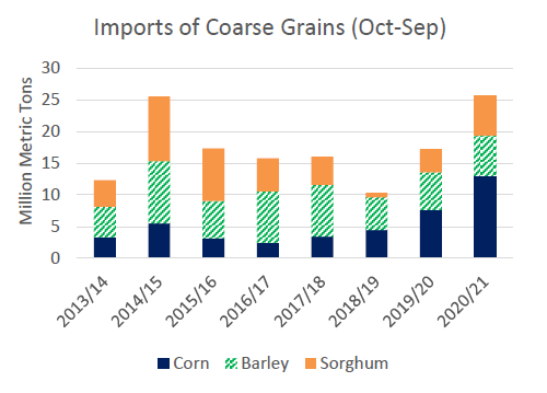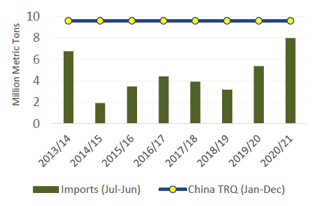 Увеличение импорта в основном происходит за счет кукурузы. Рост импорта кукурузы частично основан на данных таможенной статистики Китая и данных зерновых инспекций США по состоянию на начало ноября, которые показывают, что импорт намного превысит уровень тарифной квоты (TRQ), составляющей 7,2 млн. тонн в 2020 году. На данный момент не сообщалось о выделении дополнительной квоты Национальной комиссией по развитию и реформам, органом, регулирующим тарифные квоты.