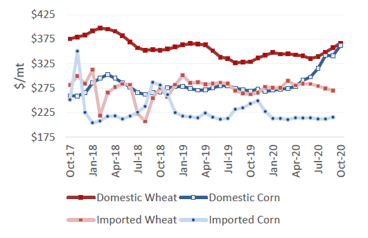 Спрос на фуражную пшеницу резко вырос из-за значительной инфляции на внутреннем рынке кукурузы. Разница между средними ценами на пшеницу и кукурузу в стране составляла 5 долларов за тонну в октябре 2020 года по сравнению с почти 60 долларами в прошлом году. Небольшая разница в ценах на кукурузу и пшеницу (цена нового урожая) стимулирует аукционные продажи китайской пшеницы старого урожая (в некоторых случаях по аналогичным ценам или ниже, чем на кукурузу нового урожая). В октябре 2020 года на внутренних аукционах было реализовано более 7,1 млн. тонн по сравнению с предыдущим годом.