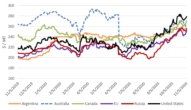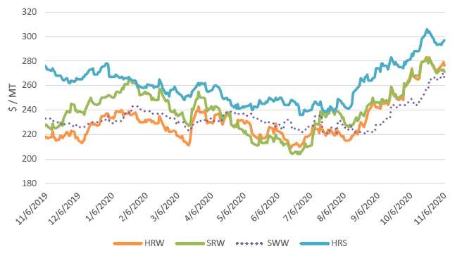 Цены на большинство классов пшеницы в США росли третий месяц подряд, в основном из-за неблагоприятных условий для выращивания озимой пшеницы в США в начале сезона и недавно посаженной озимой пшеницы в Черноморском регионе. Цены также выросли из-за увеличения спекулятивных покупок фьючерсов на пшеницу. Цена на Hard Red Winter (HRW) поднялась на 8 долларов за тонну до 276 долларов по причине крупных поставок в Китай и сохраняющихся ограниченных экспортных возможностей. Цена на Soft Red Winter (SRW) выросла на 3 доллара за тонну до 271 доллара США. Продолжающиеся активные поставки и продажи поддержали цену на Soft White Winter (SWW), которая выросла на 17 долларов за тонну, продемонстрировав наибольший скачок до 265 долларов. Hard Red Spring (HRS) была поддержана недавними продажами и поставками, поднявшись до 297 долларов.