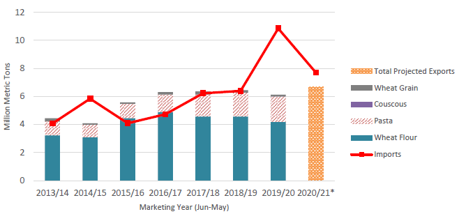 Согласно прогнозу, импорт значительно сократится по сравнению с 2019/20 годом (июнь / май) из-за более крупного внутреннего производства, но, вероятно, останется на высоком уровне при поддержке нулевых тарифов. Несмотря на рост производства, потребуется дополнительный импорт для удовлетворения внутренних потребностей. Недавние тендеры, проведенные TMO, еще больше стабилизировали внутренний рынок, и ожидается, что эти меры поддержат мукомольную промышленность страны и будут способствовать сдерживанию инфляции. Ожидается, что импорт также удовлетворит потребности сектора переработки пшеницы. Поскольку Турция является крупнейшим в мире экспортером как пшеничной муки, так и макаронных изделий, страна полагается на импорт пшеницы для поддержания объемов переработки и экспорта пшеничных продуктов, а также для удовлетворения внутреннего спроса.
