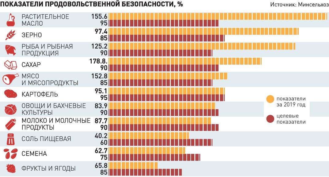 — Потребности России в основных продуктах питания мы полностью закрываем самостоятельно. По итогам 2019 года достигнуты показатели Доктрины продовольственной безопасности по зерну, сахару, растительному маслу, мясу и мясопродуктам, картофелю, рыбе и рыбопродуктам. По овощам и бахчевым культурам при пороговом значении самообеспеченности 90% мы выращиваем сами 87,7%. Фруктов и ягод при пороговом значении 60% у нас производится только 40,2%.