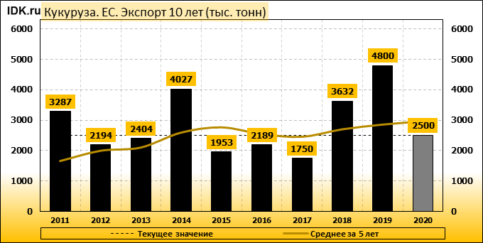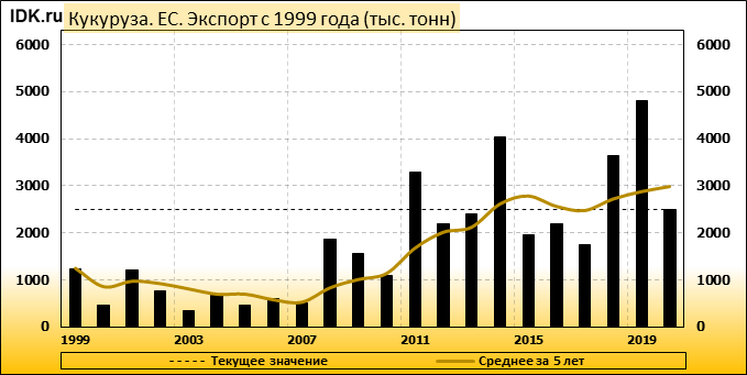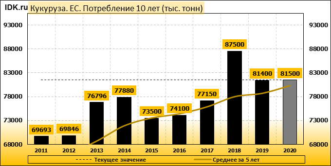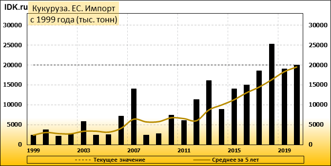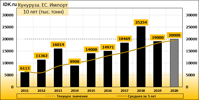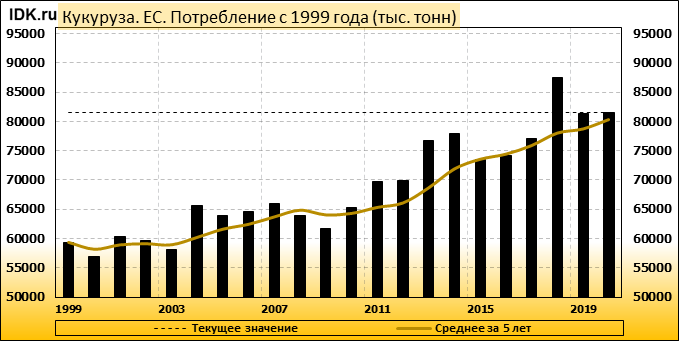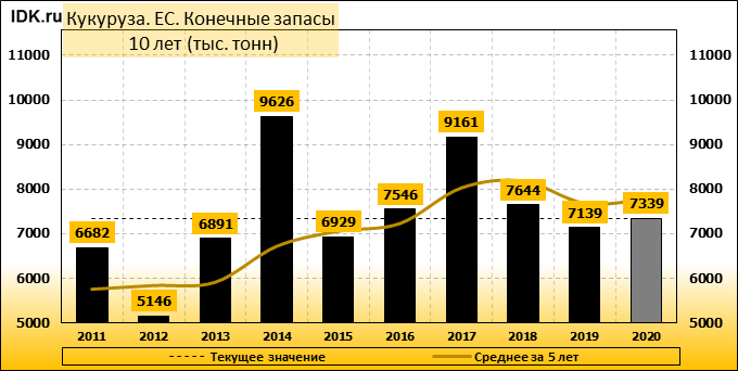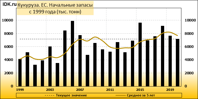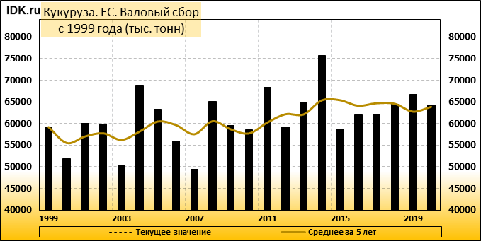 Производство кукурузы в Европейском союзе (ЕС-27 + Великобритания) в 2020/21 году оценивается в 64,2 млн. метрических тонн, что на 1,9 млн. тонн (3 процента) меньше, чем в прошлом месяце, на 2,5 млн. тонн (4 процента) меньше по сравнению с прошлым годом, но на 2 процента выше среднего уровня за 5 лет. Уборочная площадь оценивается в 8,9 млн. га, что на 0,1 млн. га меньше, чем в прошлом месяце, без изменений по сравнению с прошлым годом, и на 3% выше среднего показателя за 5 лет. Урожайность оценивается в 7,23 тонны с гектара, что на 2 процента меньше, чем в октябре, на 4 процента меньше, чем в прошлом году, и на 1 процент ниже среднего показателя за 5 лет.
