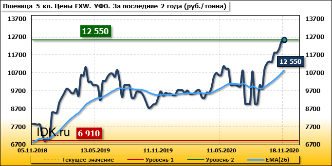 Цены на пшеницу 5-го класса повысились на 98 руб./т. и на данный момент составляют 12550 рублей за тонну.