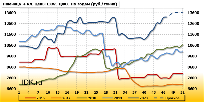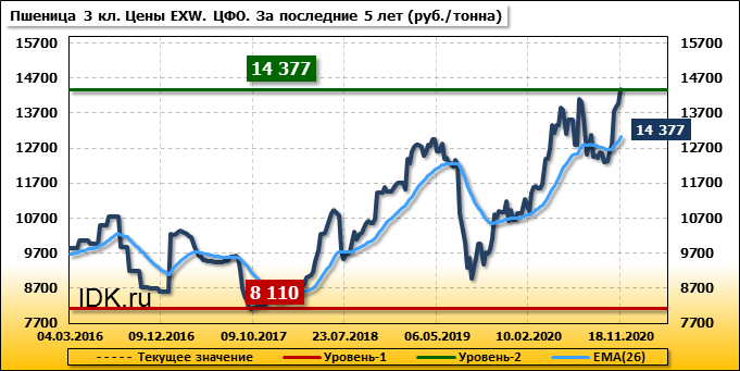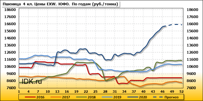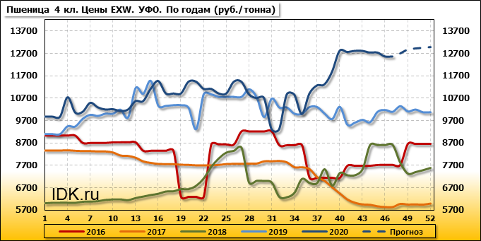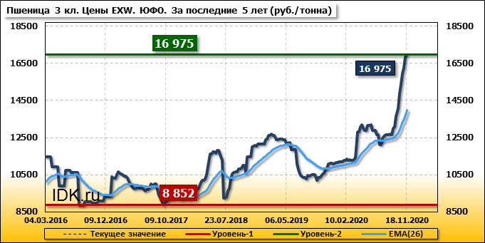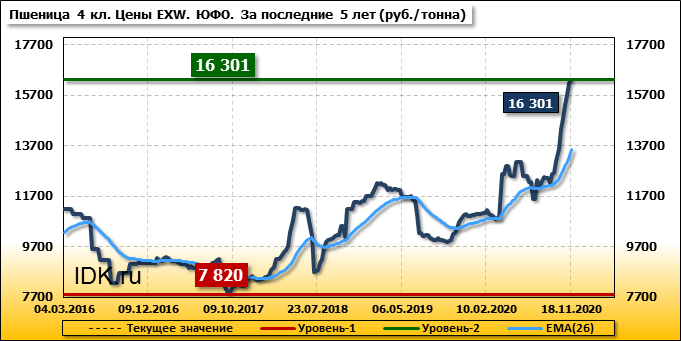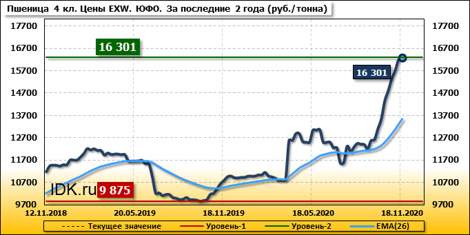 Цены на пшеницу 4-го класса поднялись на 127 руб./т. и на данный момент составляют 16301 рубль за тонну.