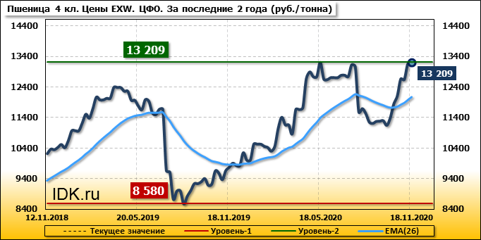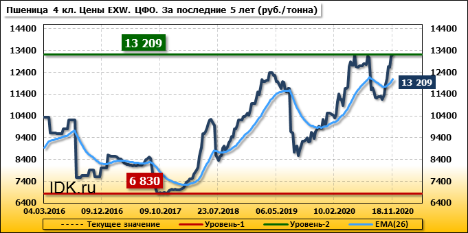 Цены на пшеницу 4-го класса поднялись на 56 руб./т. и на данный момент составляют 13209 рублей за тонну.