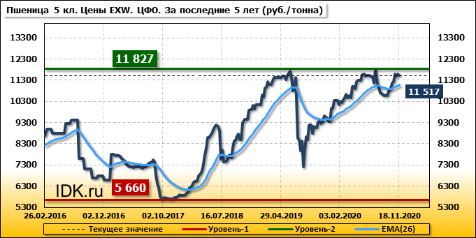 Цены на пшеницу 5-го класса понизились на 64 руб./т. и на данный момент составляют 11517 рублей за тонну.
