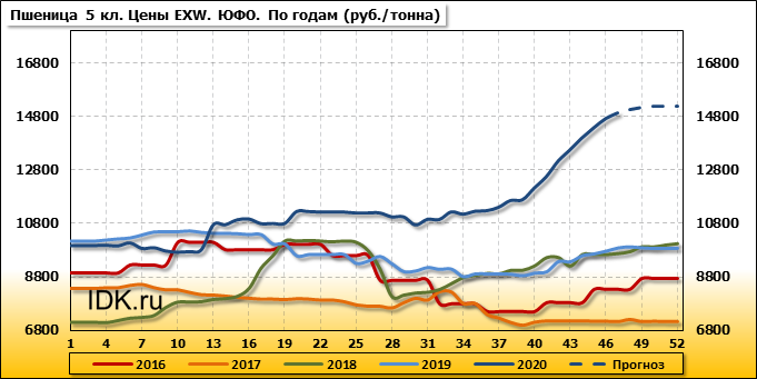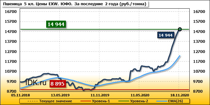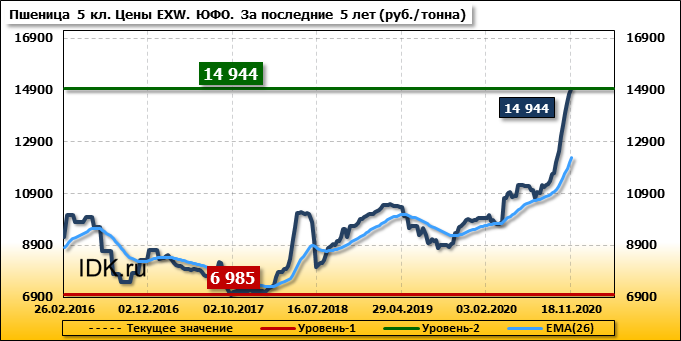 Цены на пшеницу 5-го класса повысились на 211 руб./т. и на данный момент составляют 14944 рубля за тонну.