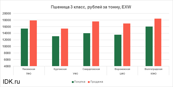 За прошедшую неделю с 16.11.2020 по 20.11.2020 средняя цена на пшеницу 3-го класса, согласно выставленным заявкам трейдеров, упала по всем округам на 603 рубля. Средняя цена составляет 16045 рублей за тонну.