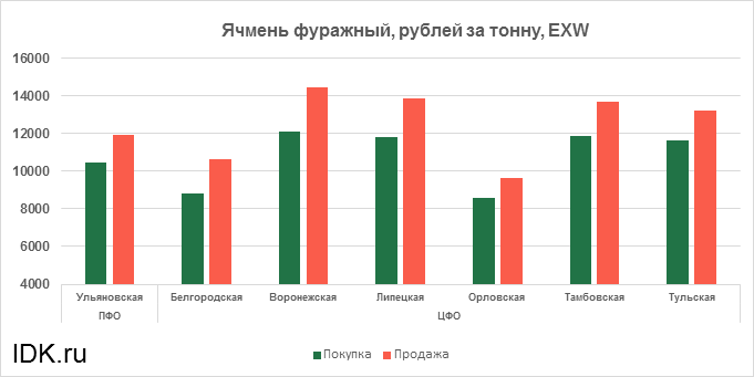 За прошедшую неделю с 16.11.2020 по 20.11.2020 средняя цена на фуражный ячмень, согласно выставленным заявкам трейдеров, упала по всем округам на 336 рублей. Средняя цена составляет 11837 рублей за тонну.