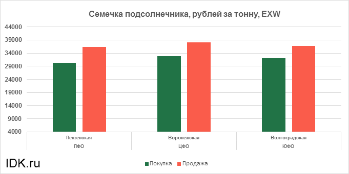 За прошедшую неделю с 16.11.2020 по 20.11.2020 средняя цена семечки подсолнечника, согласно выставленным заявкам трейдеров, выросла по всем округам на 352 рубля. Средняя цена составляет 34439 рублей за тонну.