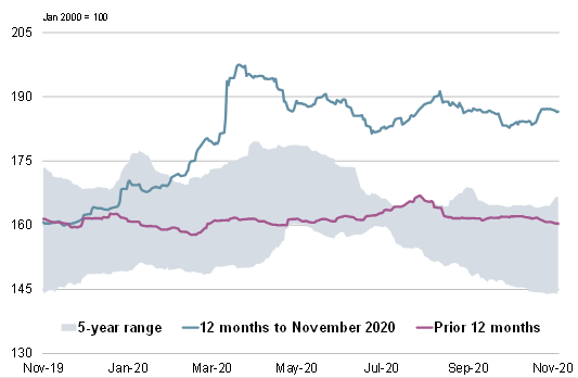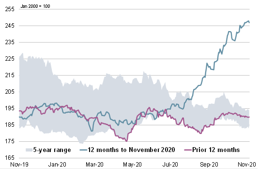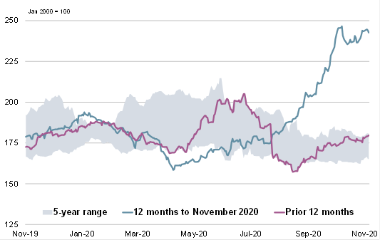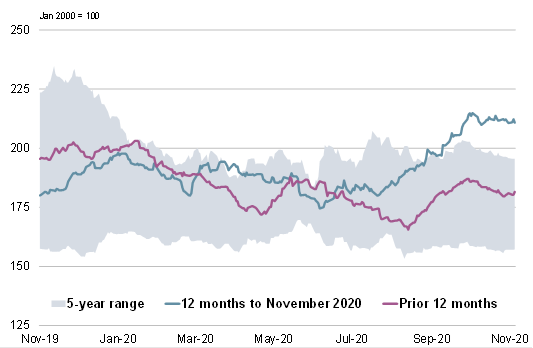 Субиндекс IGC GOI по пшенице практически не изменился по сравнению с прошлым месяцем. При поддержке со стороны пропашных культур и с неопределенными перспективами производства на 2021/22 год, средние экспортные цены оставались близки к пятилетнему пику.