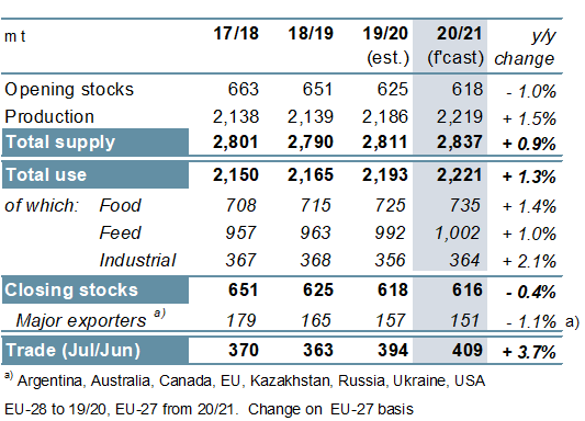 Ожидается, что мировое производство зерновых культур (пшеница и фуражное зерно) в 2020/21 году составит 2 219 млн. тонн, увеличившись на 33 млн. по сравнению с предыдущим годом. Несмотря на то, что ожидания в отношении урожая кукурузы в мире в последние месяцы снизились, прогнозируется, что объем производства кукурузы в мире будет рекордным за всю историю и составит 1 146 млн. тонн (+ 22 млн. год к году), при этом также ожидается рекордный урожай пшеницы и ячменя. Прогнозируется, что общее потребление зерна вырастет на 28 млн. тонн по сравнению с прошлым годом до 2 211 млн. за счет увеличения потребления кукурузы (+16 млн.), пшеницы (+6 млн.) и сорго (+ 3 млн.). Ожидаются новые рекорды пищевого и кормового потребления зерна в мире, в то время как для промышленного потребления прогнозируется лишь частичное восстановление после спада предыдущего сезона, что в значительной степени связано со сниженным спросом на переработку кукурузы для производства этанола. Прогнозируется, что мировые остатки зерна будут сокращаться четвертый год подряд до минимума за пять сезонов в 616 млн. тонн (-2 млн. год к году), полностью за счет сокращения остатков кукурузы (-23 млн.). Наибольшее годовое сокращение остатков кукурузы приходится на Китай и США. Прогнозируется накопление остатков для других зерновых, в том числе пшеницы (+ 13 млн. тонн, до рекордного уровня), ячменя (+4 млн.) и овса (+ 2 млн.). Ожидается, что общий объем мировой торговли зерном вырастет на 15 млн. тонн по сравнению с предыдущим годом до нового максимума в 409 млн., включая увеличение поставок кукурузы двенадцатый год подряд, рекордный объем торговли пшеницей и максимальный за четыре сезона показатель для сорго.