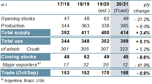 Прогнозируется, что мировое производство сои вырастет до рекордного уровня в 365 млн. тонн (+ 8% год к году) в 2020/21 году благодаря более крупному урожаю в США и ожиданиям увеличения урожая в Южной Америке. Ожидается, что мировое потребление вырастет на 5% по сравнению с прошлым годом за счет роста в Азии, в основном в Китае, где восстановление поголовья свиней и расширение производства птицы, как ожидается, приведет к росту спроса на соевый шрот, и в Северной и Южной Америке, где, по предварительным оценкам, объем переработки в Аргентине вырастет. В условиях сильного спада в США, который лишь частично компенсируется ростом в других странах, в том числе в Бразилии и Китае, прогнозируется сокращение глобальных переходящих остатков. После резкого роста в предыдущем году торговля может снизиться в 2020/21 году, поскольку крупные закупки Китая контрастируют с потенциальным умеренным сокращением поставок на относительно более мелкие рынки из-за большей доступности и высоких международных цен.