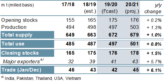 Несмотря на слабый спрос и перебои в экспортных потоках в начале года из-за пандемии COVID-19, ожидается, что мировая торговля рисом в 2020 году (январь / декабрь) будет лишь незначительно ниже по сравнению с прошлым годом. Это связано с более крупными, чем ожидалось, поставками во второй половине сезона, в основном у Индии. Ожидается, что потребление в 2019/20 году достигнет нового пика, при этом рост будет в первую очередь обусловлен расширением государственных программ продовольственной помощи в Индии, в то время как остатки на конец сезона могут остаться в целом неизменными по сравнению с прошлым годом. Прогнозируется, что производство в 2020/21 году вырастет на 6 млн. тонн по сравнению с прошлым годом до максимума в 503 млн., включая более высокие показатели основных экспортеров. Мировое потребление продолжит увеличиваться с ростом населения, в то время как остатки могут расти и дальше. Ожидается, что в 2021 году объем торговли вырастет на 6% по сравнению с предыдущим годом до 45 млн. тонн, в связи с ожиданиями более высокого спроса со стороны импортеров из стран Африки к югу от Сахары.