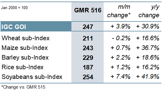 Благодаря ралли на рынке соевых бобов, индекс IGC GOI поднялся на 4% по сравнению с прошлым месяцем, до максимального уровня за шесть сезонов.