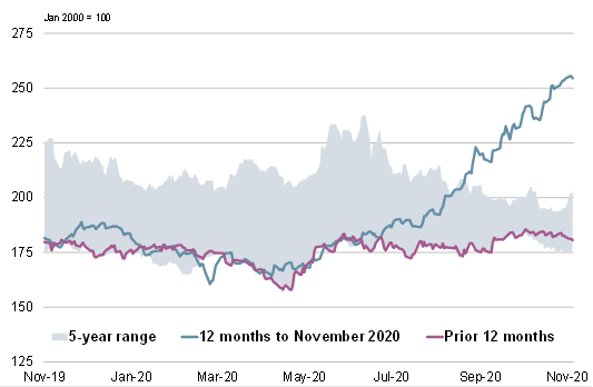 На фоне опасений по поводу погодных условий в Южной Америке, субиндекс соевых бобов IGC GOI вырос в ноябре на 7% до самого высокого уровня с середины 2014 года.