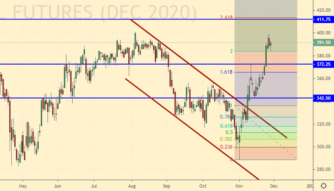 Сценарий роста: рассматриваем декабрьский фьючерс, дата экспирации 10 декабря. Цель на 410.0 в поле зрения. Держим лонги. Рост воспринимается как агрессивный. В любой момент на рынке может начаться коррекция. Это нервирует.