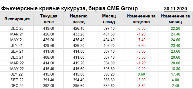 На 30.11.2020 стоимость кукурузы на бирже CME Group по контракту DEC 20 составила 419.6 цента за бушель. За прошедшую неделю стоимость кукурузы на площадке CME Group упала на 6.8 цента/бушель. Как мы видим на графике, фьючерсная кривая имеет периоды, когда более дальний фьючерс дешевле ближнего. Состояние бэквардации наблюдаем на следующих контрактах: SEP 21; DEC 21; SEP 22. Таким образом, трейдеры предполагают, что возможно превалирование предложения над спросом в указанные периоды.