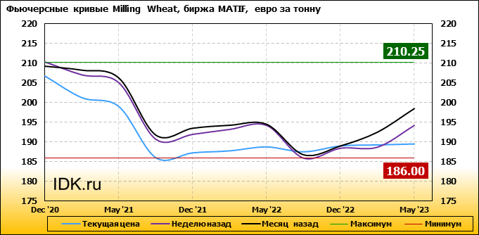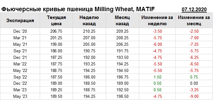 На 07.12.2020 стоимость пшеницы Milling Wheat на бирже MATIF по контракту Dec ’20 составила 206.75 евро за тонну. За прошедшую неделю стоимость пшеницы Milling Wheat упала на 3.5 евро/тонна. Как мы видим на графике, фьючерсная кривая имеет периоды, когда более дальний фьючерс дешевле ближнего. Состояние бэквардации наблюдаем на следующих контрактах: Mar ’21; May ’21; Sep ’21; Sep ’22. Таким образом, трейдеры предполагают, что возможно превалирование предложения над спросом в указанные периоды.