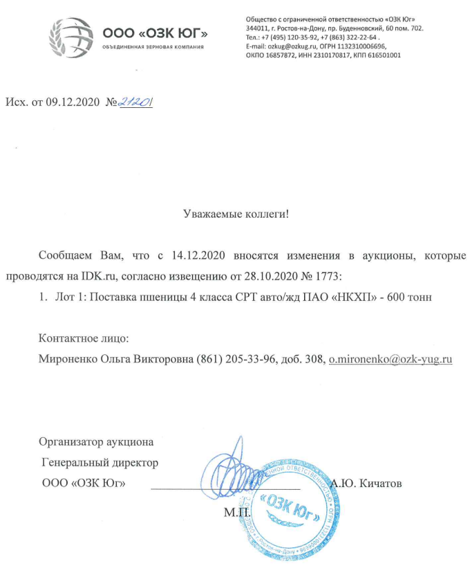 ООО «ОЗК Юг» с 14-го декабря вносит изменения в аукционы, которые проводятся на электронной торговой площадке IDK.ru по закупке пшеницы согласно извещения № 1773 от 28.10.2020 г.: