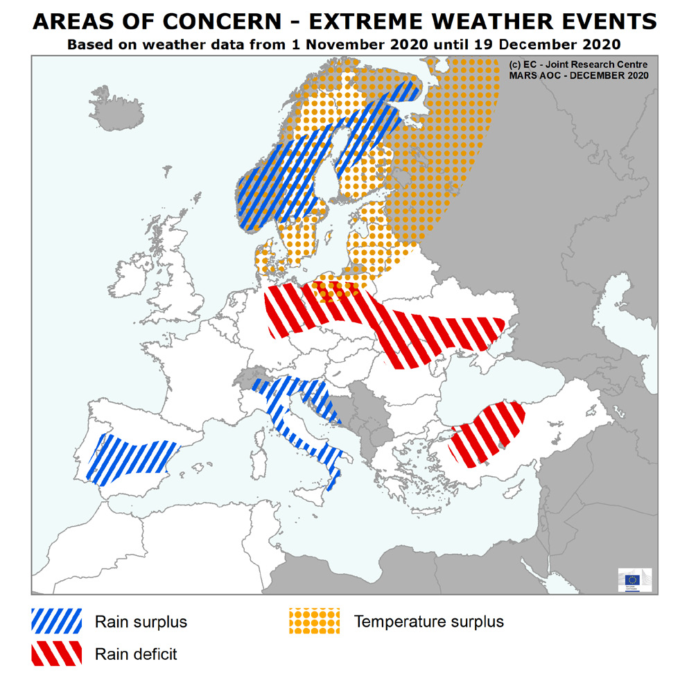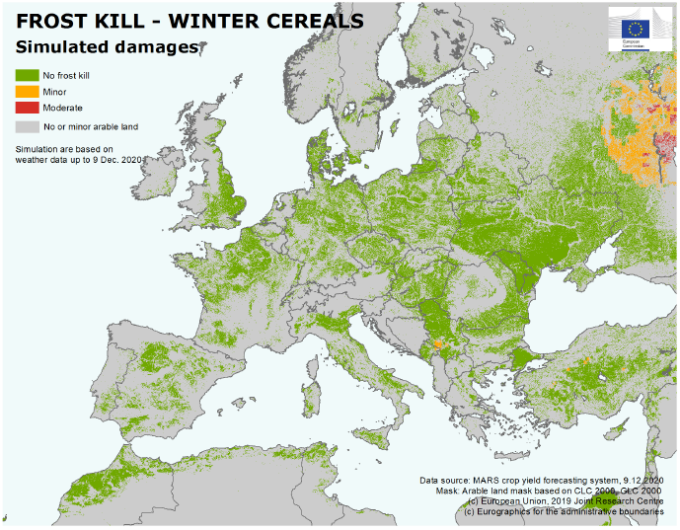 Ожидается, что локальные и незначительные повреждения от заморозков уже произошли на севере Румынии из-за резкого похолодания в конце ноября и начале декабря. Согласно модели MARS, более распространенные случаи вымерзания растений, вероятно, имели место в Приволжском округе европейской части России.